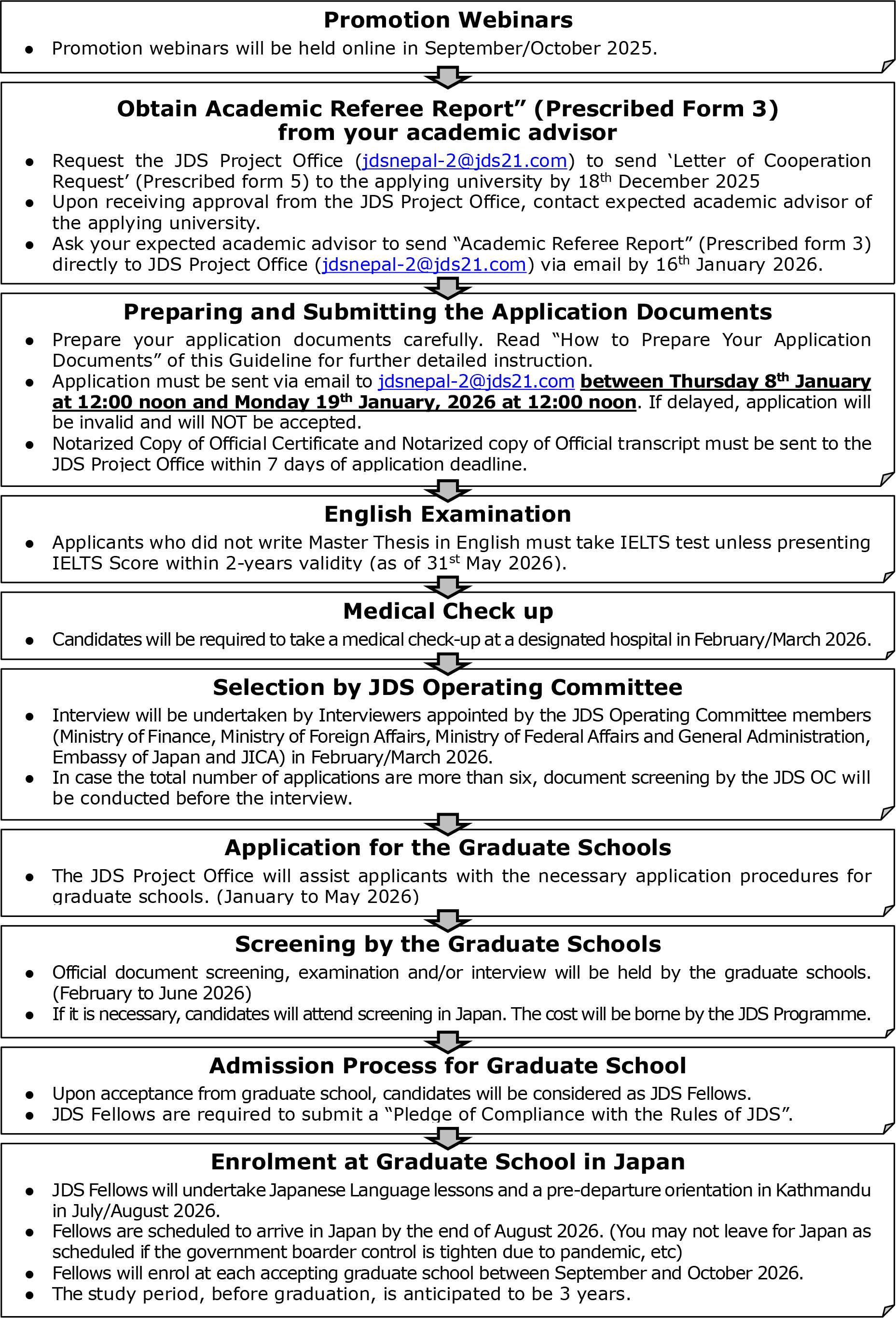 - Applicants should have a clear understanding of the objectives of the JDS Program and desire to contribute to the development of Nepal upon return to Nepal after completing the study.